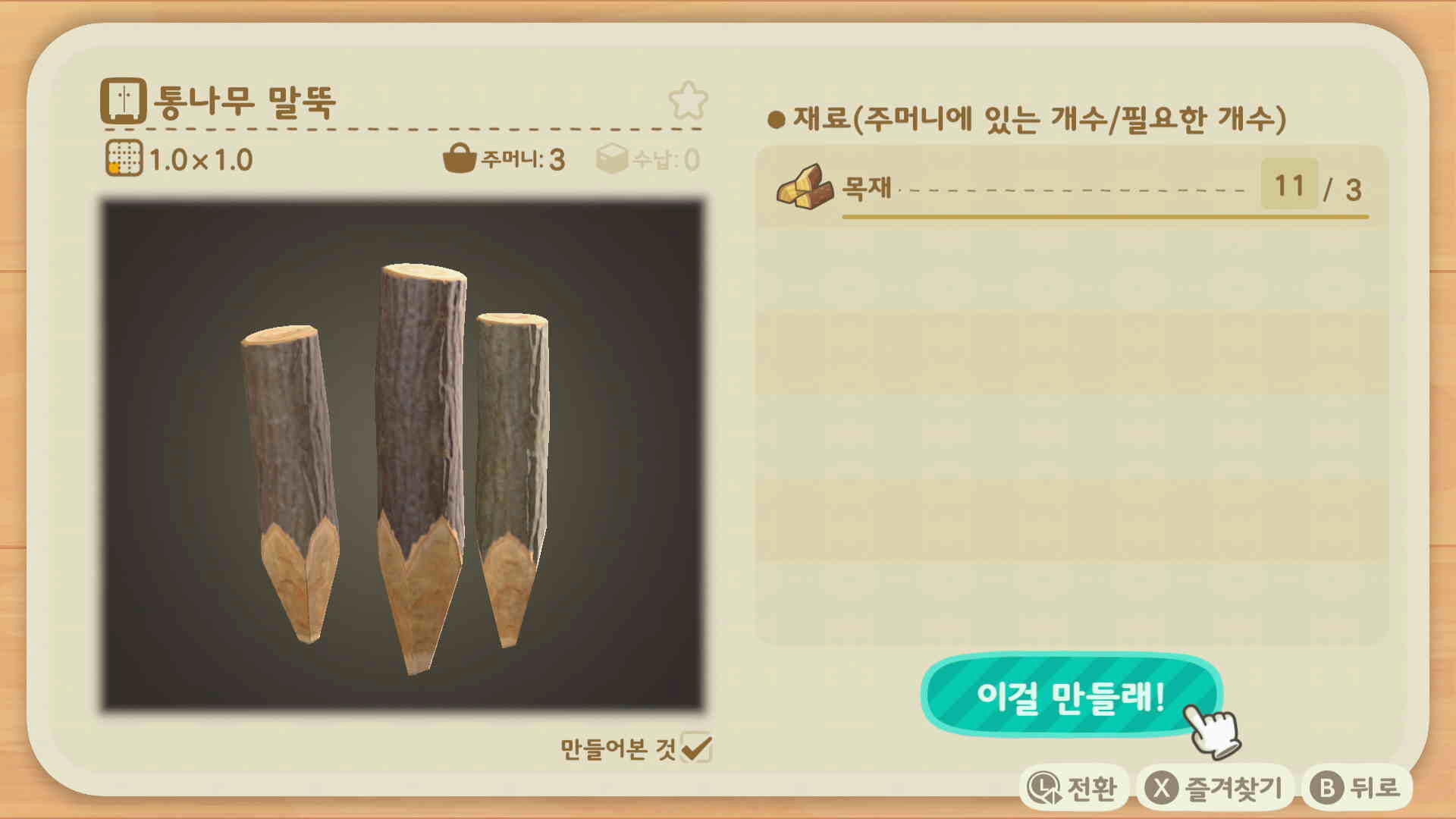 통나무 말뚝 1개를 만들기 위해서는 목재 3개가 필요하며, 통나무 말뚝은 작업대 밑으로 내리면 제작이 가능합니다.