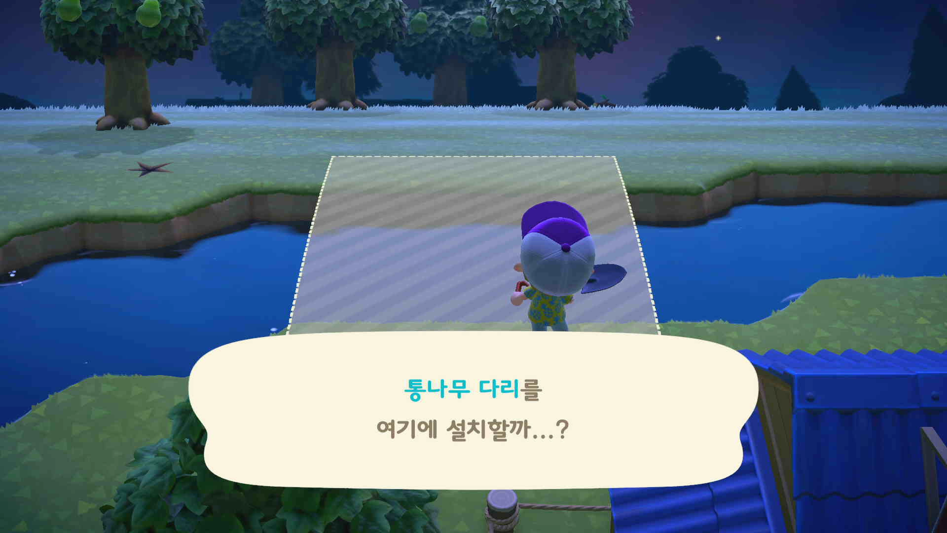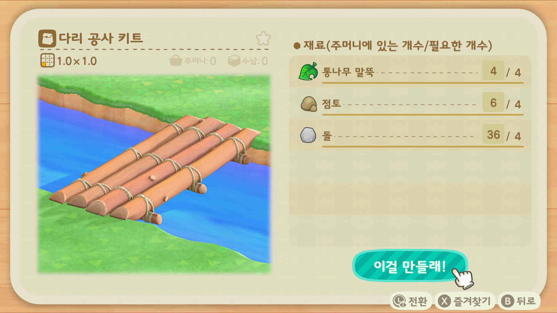 통나무 다리를 건설하기 위해서는 박물관 / 너굴 상점 건설이 선행 되야 합니다.