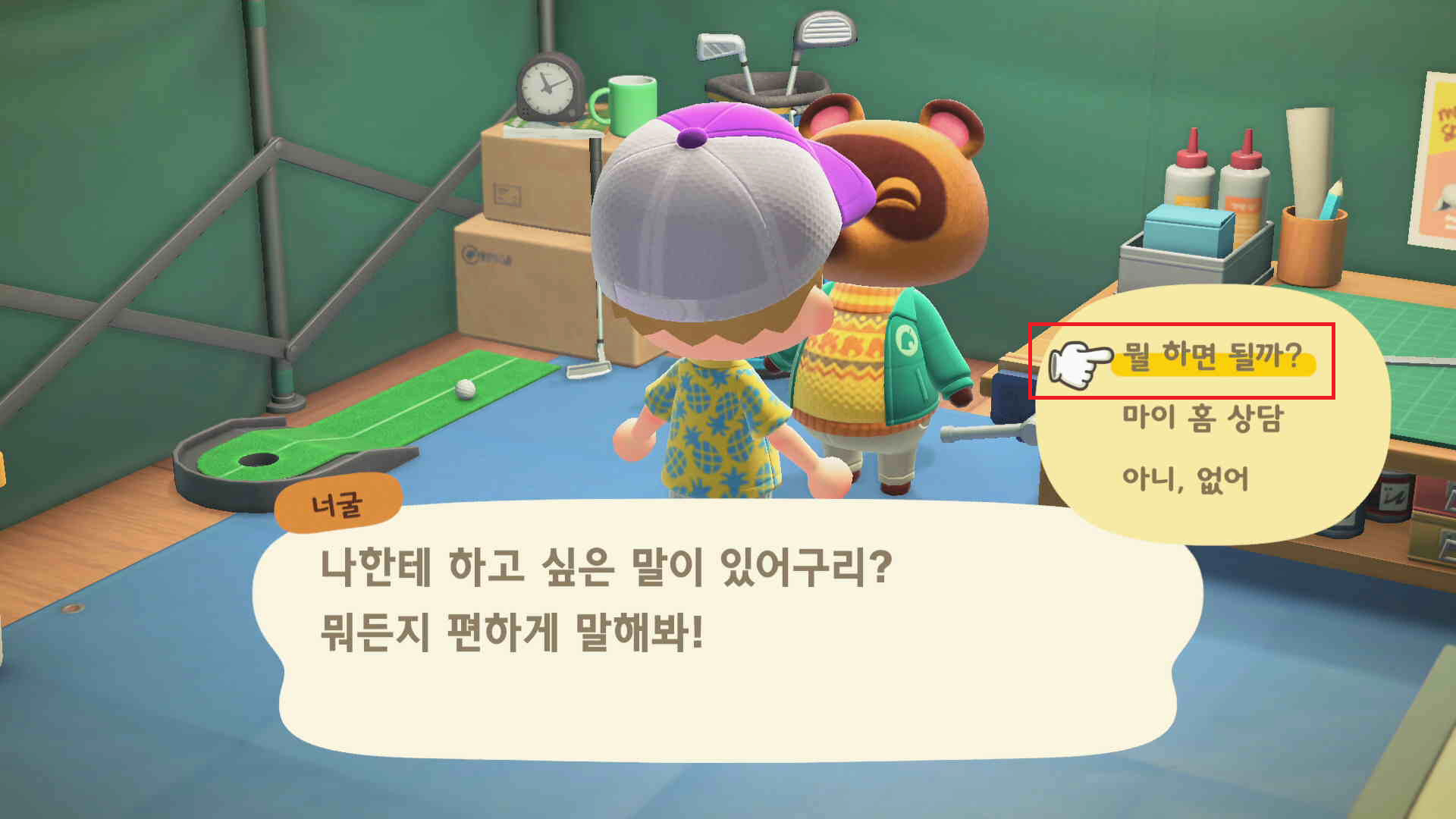 1. 너굴 상점을 건설 후 너굴이에게 "뭘 하면 될까?"로 질문을 합시다.