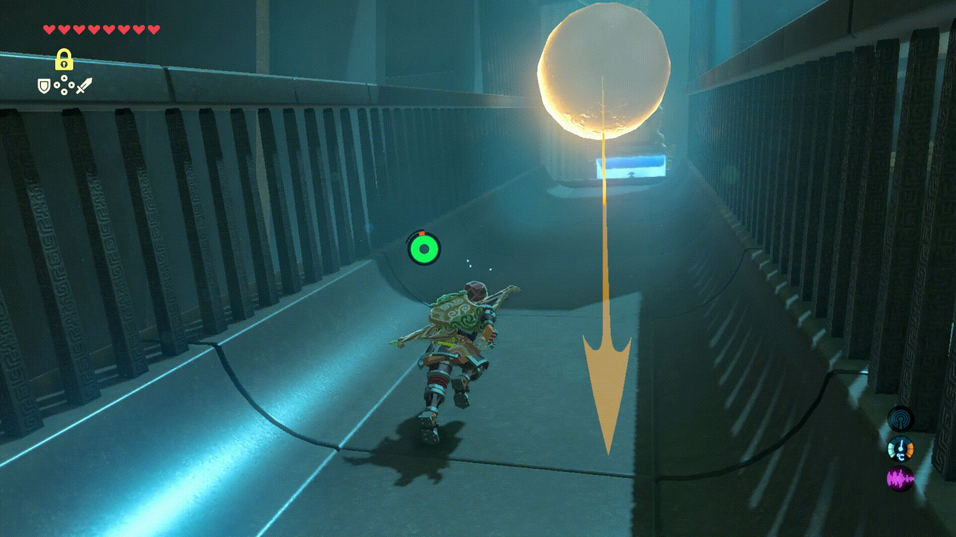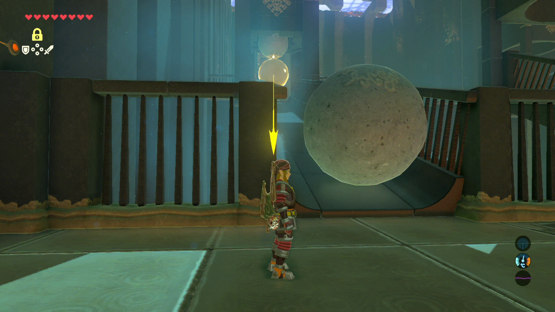 사당에 들어가면, 언덕이 보이고 공이 떨어집니다. 타임 록을 사용하여 공이 떨어질 때 시간을 멈춰주도록 합시다.